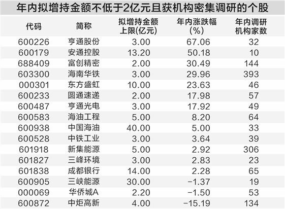 结合机构关注情况来看,截至11月19日,年内获得10家及以上机构调研,且拟增持金额上限不低于2亿元的公司有16家,包括拟增持金额超过10亿元的中国海油、三峡能源、成都银行(601838)等。调研机构数超过百家的有新集能源(601918)、富创精密、中炬高新(600872)等。