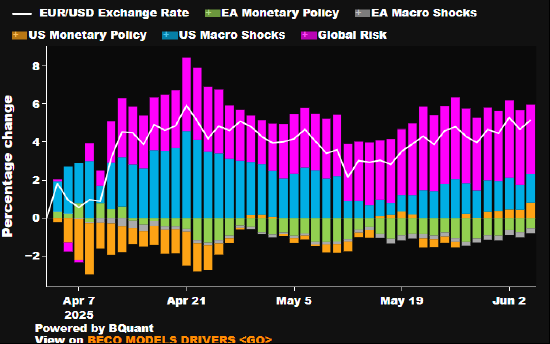 驱动模型显示,尽管欧洲央行的政策看法对欧元产生了轻微的负面影响,但对美国宏观环境和货币政策的看法转变,远远抵销了这些影响——自4月2日特朗普宣布全面征收关税以来,这两者都导致美元走软。