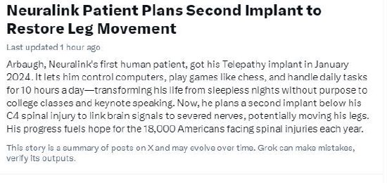 马斯克在社交平台X上分享消息称,他的脑机接口公司Neuralink的首位人类受试者诺兰·阿博正计划进行第二次植入,有望恢复腿部活动