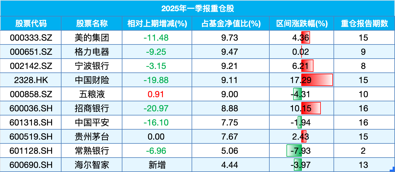 2024年年报显示换手率仅为20%。其行业集中度持续提升,该基金在申万一级行业中的家用电器、银行、非银金融三大行业配置占比分别达28.68%、25.02%和24.60%,合计仓位高达78.30%。这种“聚焦式”投资同样体现在个股层面,美的集团、招商银行等核心标的已连续持有至少15个报告期。