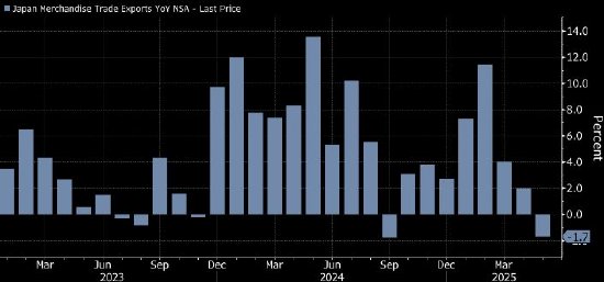 由于美国的关税措施令全球贸易承压,日本出口八个月来首次下滑,这加剧了在年初经济萎缩之后陷入技术性衰退的风险。