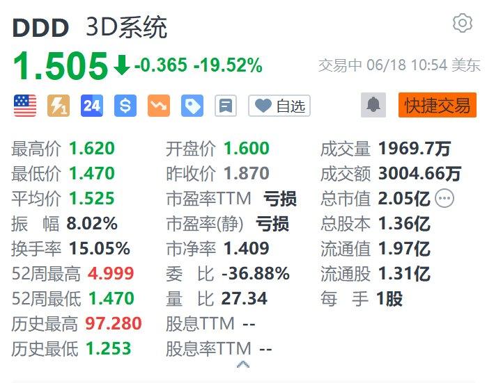 美股异动丨3D Systems跌超19.5% 发行9200万美元的可转换票据