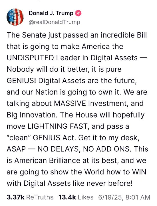 特朗普在社交媒体发文称:参议院刚刚通过了一项令人难以置信的法案,这将使美国成为无可争议的数字资产领导者——无人能出其右,这简直是天才之举!数字资产是未来,我们的国家将主宰它。我们谈论的是大规模投资和重大创新。希望众议院也能以闪电般的速度行动,通过一项“干净”的“天才法案”。尽快送到我的办公桌上——不要拖延,不要附加任何内容。这是美国智慧的最佳体现,我们将向世界展示如何以前所未有的方式在数字资产领域取胜!