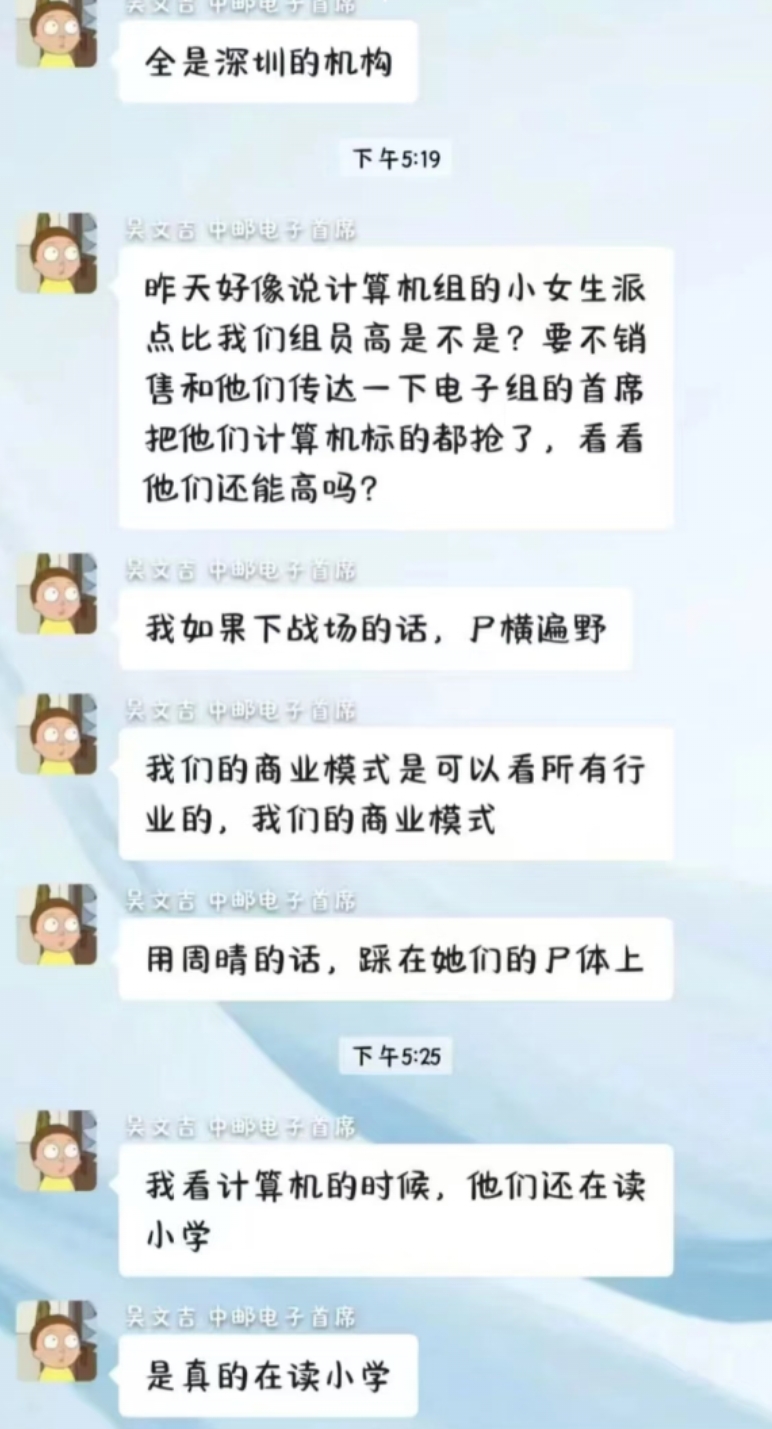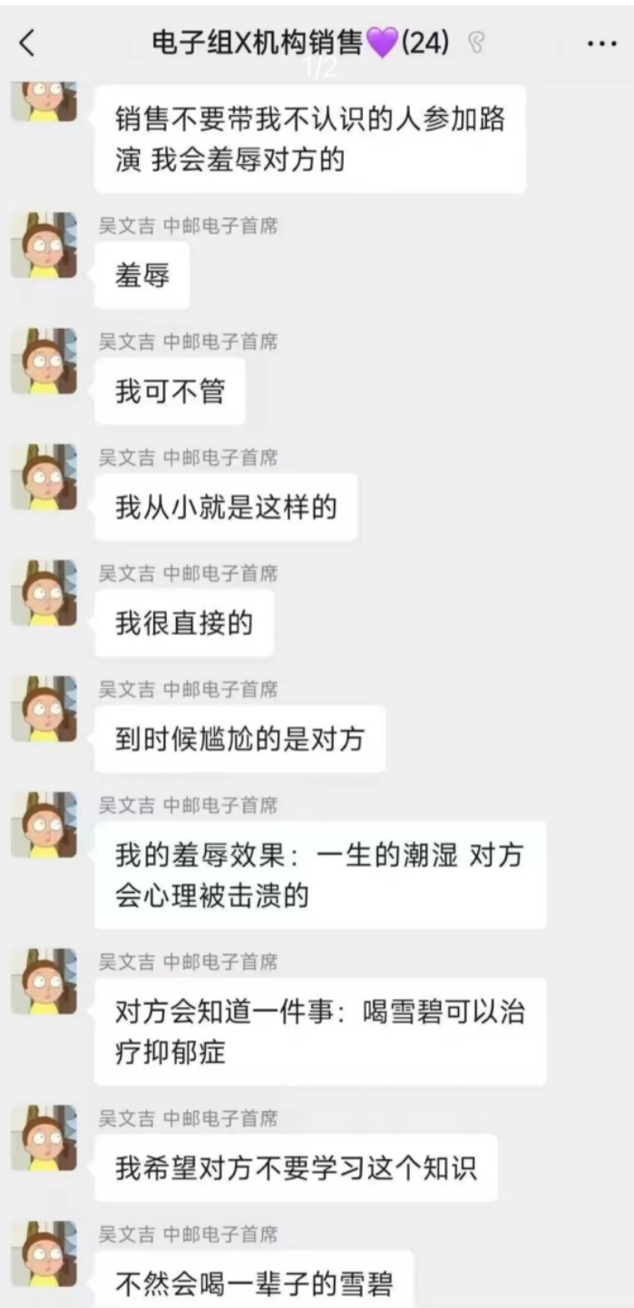 6月19日消息,近期券商行业一则内部聊天记录近日引起热议。网络流传截图显示,中邮证券电子行业首席分析师吴文吉在微信群内要求销售团队“不要带不认识的人参加路演”,并称否则将“直接羞辱对方”,效果是“一生的潮湿”,让对方知道“喝雪碧可以治疗抑郁症”,引发了对行业生态的讨论。