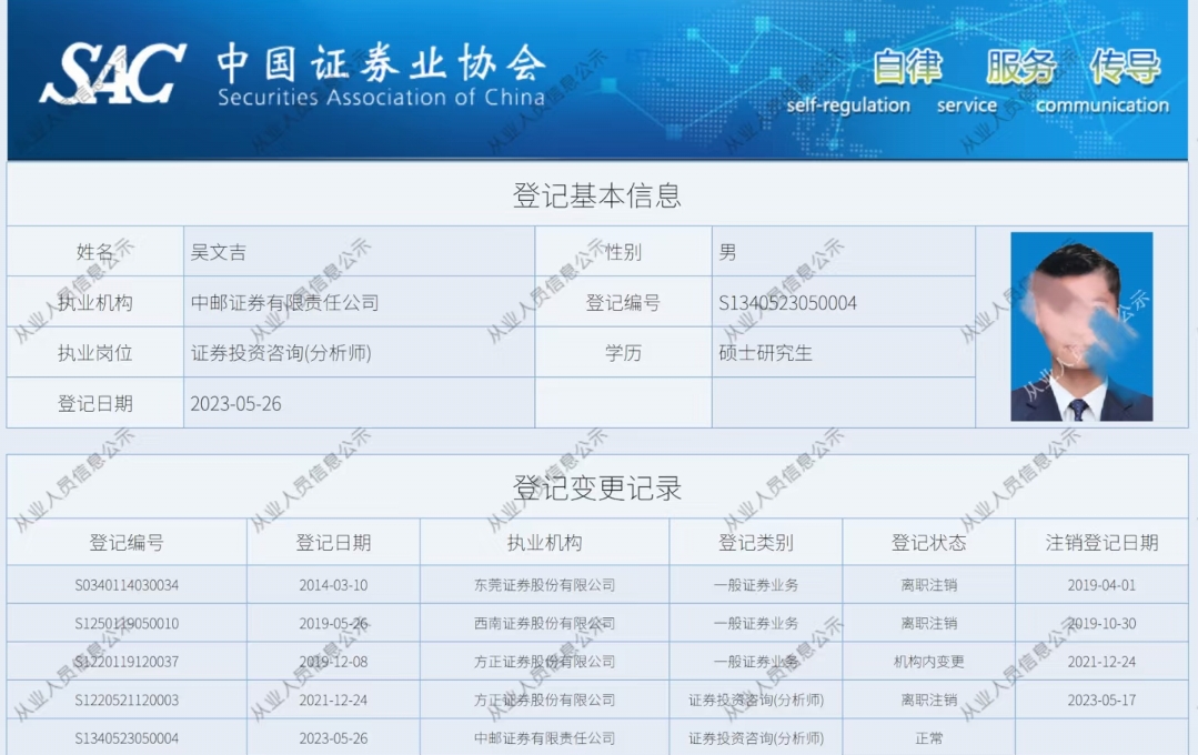 从公开履历可见,吴文吉为硕士研究生,2023年5月加入中邮证券,此前曾在东莞证券、西南证券等多家机构任职。