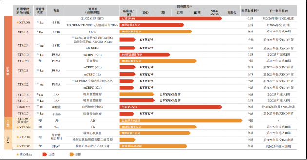 其中,XTR008是一种处于注册阶段的177Lu标记生长抑素受体(SSTR)靶向的放射配体,用于神经内分泌肿瘤的治疗。XTR006是一种18F标记的微管蛋白相关单元(tau)靶向的PET诊断用放射性配体,用于诊断疑似阿尔茨海默病或AD痴呆引起的轻度认知功能障碍。XTR004是一种18F标记的线粒体复合体I靶向的诊断用放射性配体,用于PET-心肌灌注成像。XTR003是一种18F标记的PET诊断用放射性配体,用于心肌脂肪酸代谢成像,以检测心肌存活性。