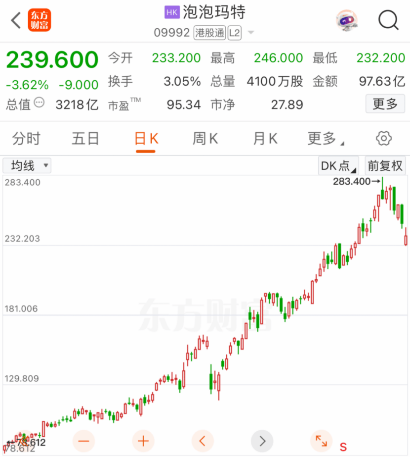 与此同时,华尔街投行们对泡泡玛特的态度也出现了分歧,有部分投行警告当前泡泡玛特的估值过高,股价或存在回调风险,Labubu价格的震荡反映出潮玩市场的脆弱性。截至6月20日收盘,泡泡玛特的市盈率(TTM)高达96.8倍。