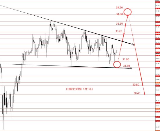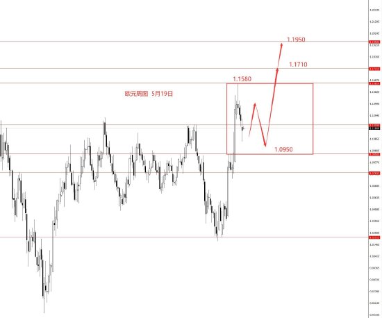 5月19日,上周一美指直接向上破位,到达102附近后承压震荡修整,周图收阳柱。从图形来看,美指仍在震荡修整,后市继续在97.80-103.20区间震荡时间周期最少还有1-2个月时间,震荡完结后,再继续中线下跌。本周短线仍然以震荡格局为主,周初关注100.30区域强支撑,以上继续上行,上方关注101.50和102.20/102.40区域,再择机做空,下方关注99.30和99.00区域强支撑。今日只有框架思路,没有具体操作建议。