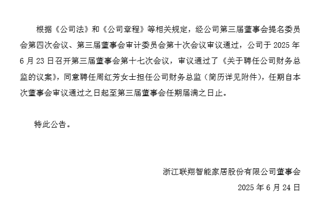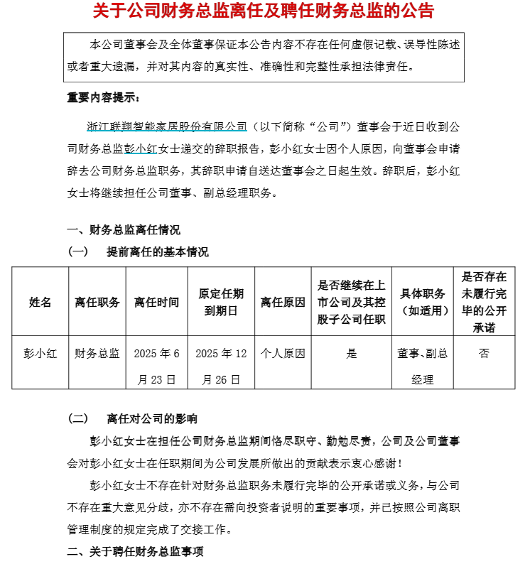 6月23日,浙江联翔智能家居股份有限公司(以下简称“联翔股份”)一则公告悄然引发行业关注——周红芳跨行业履新联翔股份,财务总监彭小红八年稳定护航后离任。
