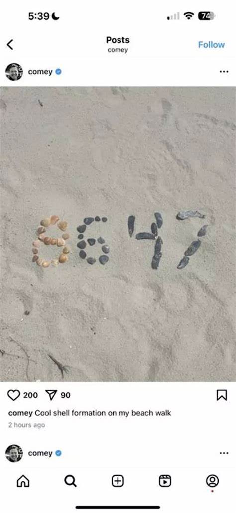 科米周四晚在Instagram澄清:“早前发布的海滩漫步时看到的贝壳排列照片,我原以为只是政治隐喻。从未意识到这些数字会与暴力产生关联,我反对任何形式的暴力,因此已删除帖文。”