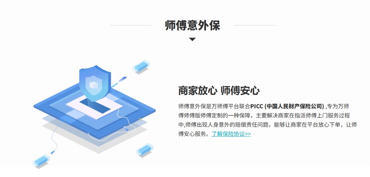 为保障师傅群体的生命财产安全,万师傅联合中国人保(601319)(PICC)为师傅群体定制专属保险――师傅意外保险,切实为师傅群体保驾护航。服务过程中,师傅发生人身伤亡或造成非责任内的财产损失,都将由上述定制保险提供赔付。