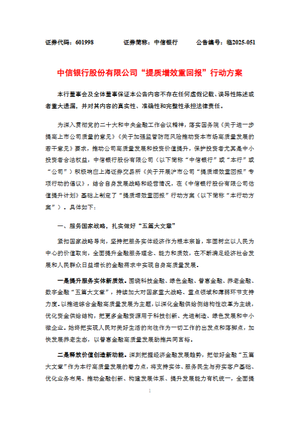 6月27日金融一线消息,中信银行今日发布公告称,该行积极响应上海证券交易所《关于开展沪市公司“提质增效重回报”专项行动的倡议》,结合自身发展战略和经营情况,在《中信银行股份有限公司估值提升计划》基础上制定了“提质增效重回报”行动方案。