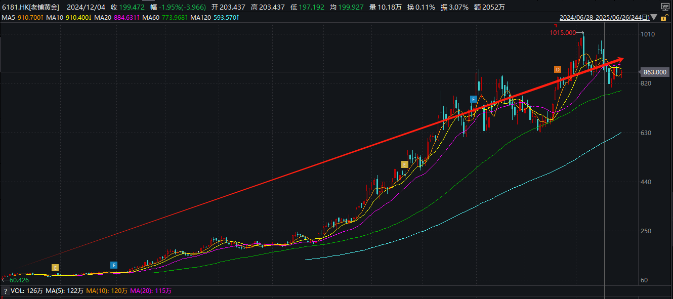 并且,自2024年下半年以来,港股新市场出现回暖迹象,泡泡玛特、蜜雪冰城以及老铺黄金3家消费企业股价持续大涨,被誉为港股的“消费三枝花”。其中,老铺黄金自2024年6月以来,股价震荡大幅向上。股价自2024年6月底的69.4港元/股,增长至最高1015港元/股,最高涨幅高达1362.54%。