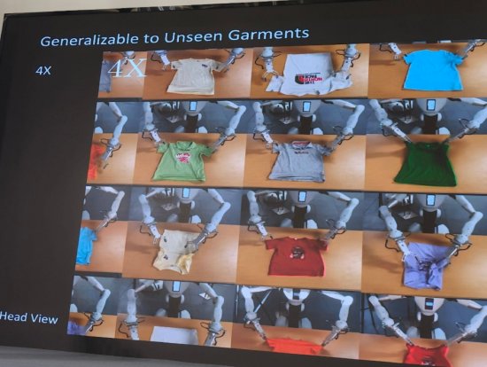 王鹤总结,除了工商业场景,我们还为家用环境制造了大量合成数据资产,银河通用合成了涵盖长袖、短袖、帽衫、卫衣、短裤、长裤等多种衣物的高精度操作数据。这是全球首个完全基于合成大数据训练的衣服操作大模型,仅需RGB输入即可实现精准操作,特别值得注意的是,该模型在真实世界未见过的衣物类型上依然展现出优异的泛化能力。