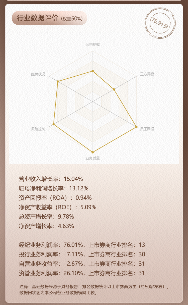 按照上述方法,申万宏源张剑行业数据评价总得分为75.91分,在50家上市券商中排名第18名,在8家参评综合性上市券商中排名第7名。