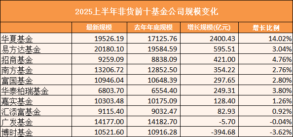 2025年上半年公募基金规模数据揭晓,wind数据显示,非货规模TOP10基金公司中,华夏基金以14%高增长稳居首位,招商基金增速近5%,华泰柏瑞增速近4%。TOP1易方达基金增速3%。汇添富、嘉实增速低于1.3%,广发基金微跌5.7亿持平,博时基金缩水394亿,增速-3.62%垫底,行业格局正加速重构。