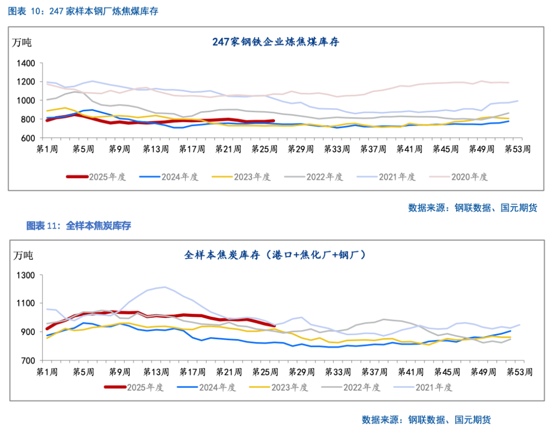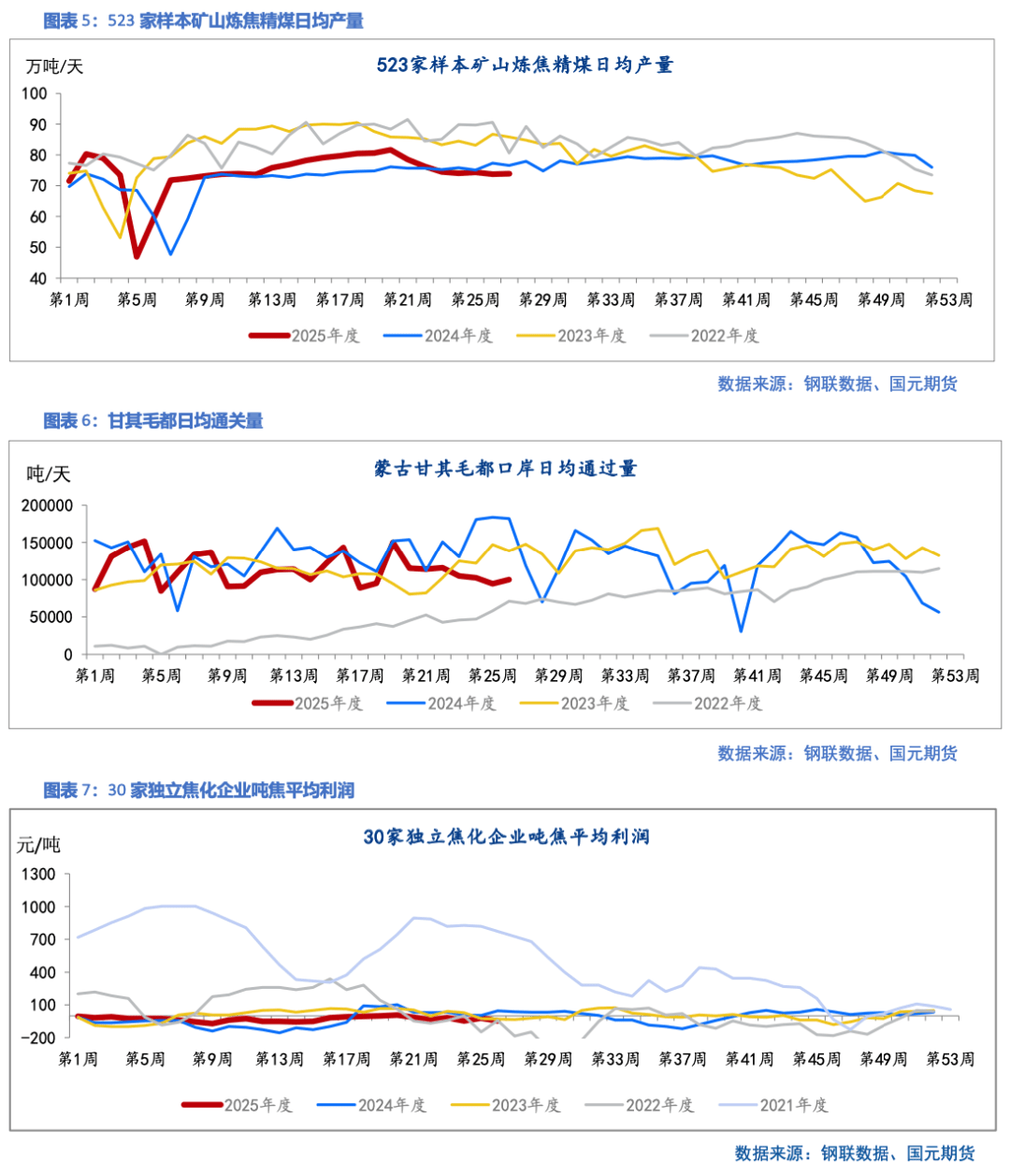 上周,230家样本独立焦化厂焦炭日均产量为51.67万吨/天,周环比变化-0.21%;270家样本独立焦化厂焦炭日均产量为64.51万吨/天,周环比变化-0.29%;247家钢厂焦化厂日均产量47.43万吨/天,周环比变化0.08%。截至2025年6月27日,独立焦化厂吨焦利润为-46.0元/吨,周环比变化-23.0元/吨。