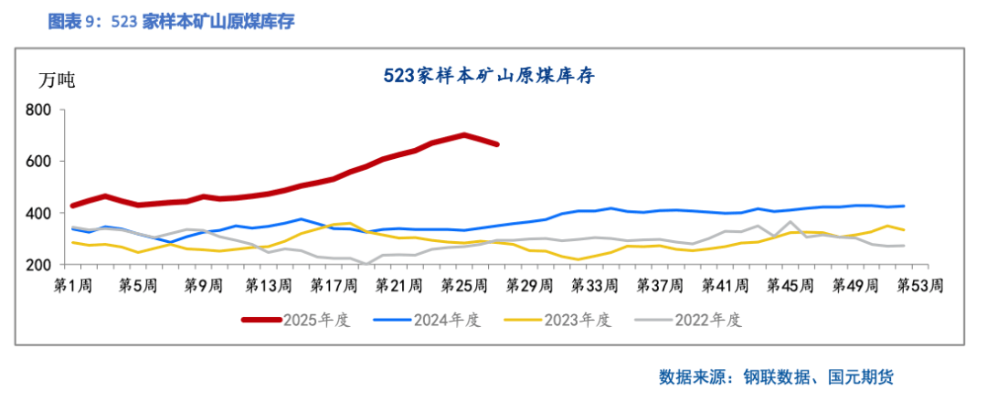 本周矿山精煤库存为409.61万吨,周环比变化-11.55%;矿山原煤库存为665.42万吨,周环比变化-2.65%。上游矿山原煤精煤库存明显下降,下游有多补库。上周,247家钢厂焦煤库存为781.21万吨,周环比变化0.85%;270家独立焦化厂焦煤库存为808.98万吨,周环比变化1.66%;港口焦煤库存为303.31万吨,周环比变化-5.84%。