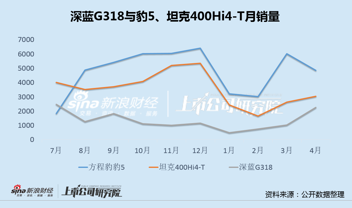 去年7月,深蓝G318开启交付,当月销售2400台,也是迄今为止的最高月销量,上市至今10个月,月均仅1000余台,相比定价更高的豹5和坦克400Hi4-T等竞品销量反而更低,产品力明显不足。