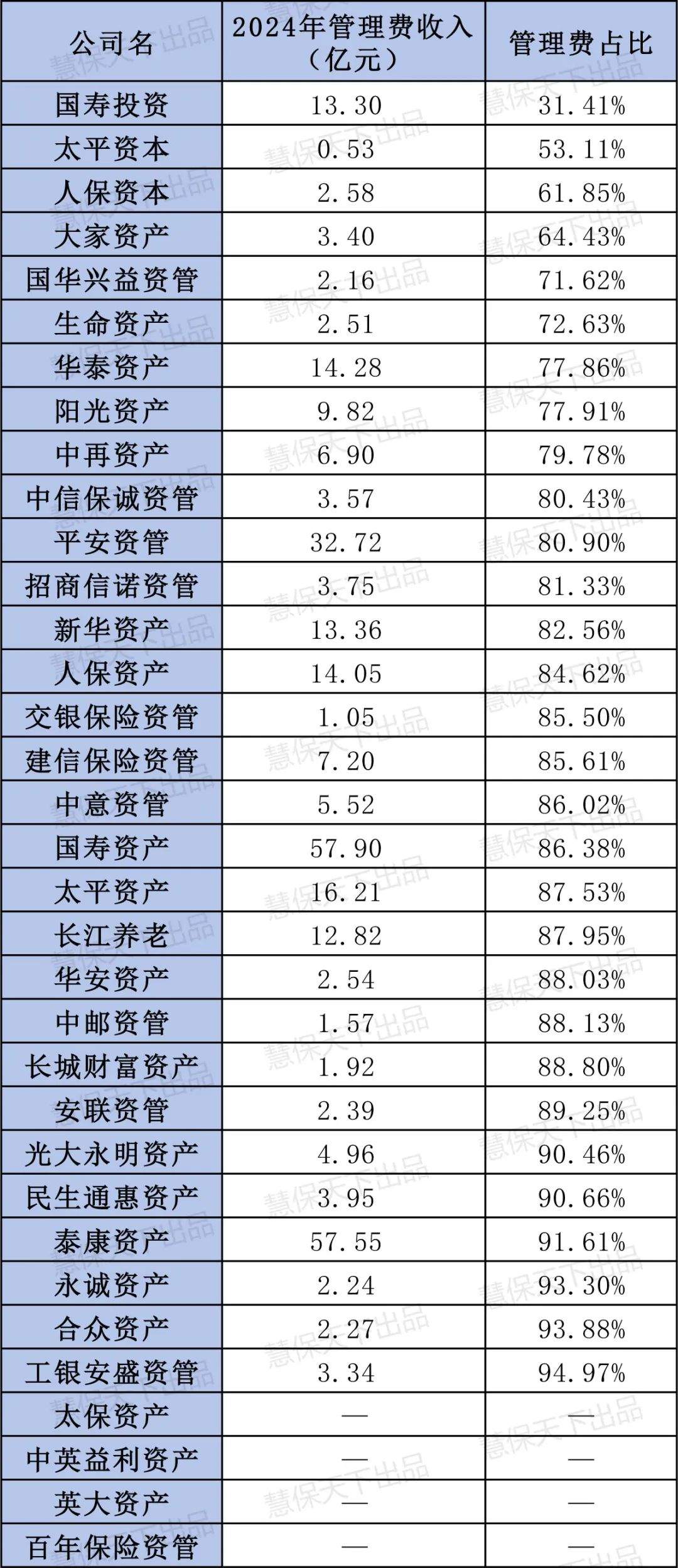 『慧保天下』统计了保险资管公司披露的资产管理费收入,除太保资产、中英益利资产、英大资产、百年保险资管外,30家保险资管机构2024年的资管费营收占比平均值为80.95%,在继续降低。
