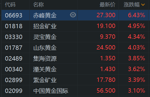金价上涨黄金股集体走强,其中,赤峰黄金涨6.5%,招金矿业涨超5%,灵宝黄金、山东黄金涨超4%,潼关黄金、紫金矿业、中国黄金国际涨超3%。