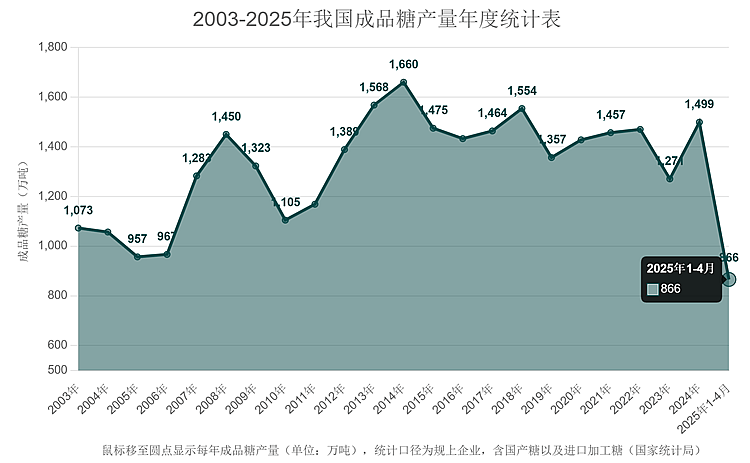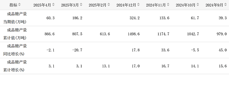 YNTW.COM 据国家统计局最新发布的数据,2025年4月份我国成品糖产量为 60.3 万吨,同比减少2.1%;1-4月份累计成品糖产量为 866.6 万吨,同比上年同期增长3.1%。