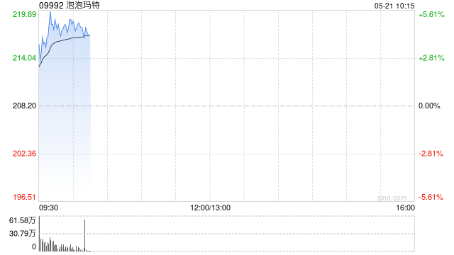 泡泡玛特(09992)盘中涨超5%,高见220港元,再创新高。截至发稿,股价上涨4.61%,现报217.80港元,成交额9.62亿港元。