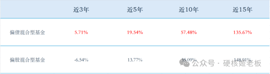 我拿偏股基金和偏债基金来举例,截至5月9号收盘,固收+的代表作――偏债混合型基金,近3年、近5年、近10年平均收益都跑赢了偏股基金,只拉长到15年的时候,偏股基金才展现出来优势。