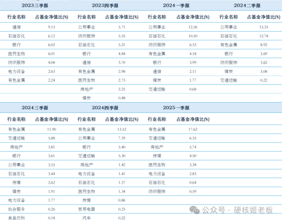 我拉了下这只基金的前十大权益持仓,像红利和黄金这一波,他可能都是提前布局,然后享受到市场拔估值阶段的收益,而且略偏好不太受关注的传统行业(比如纺织、石油石化、公用事业、有色金属等)。
