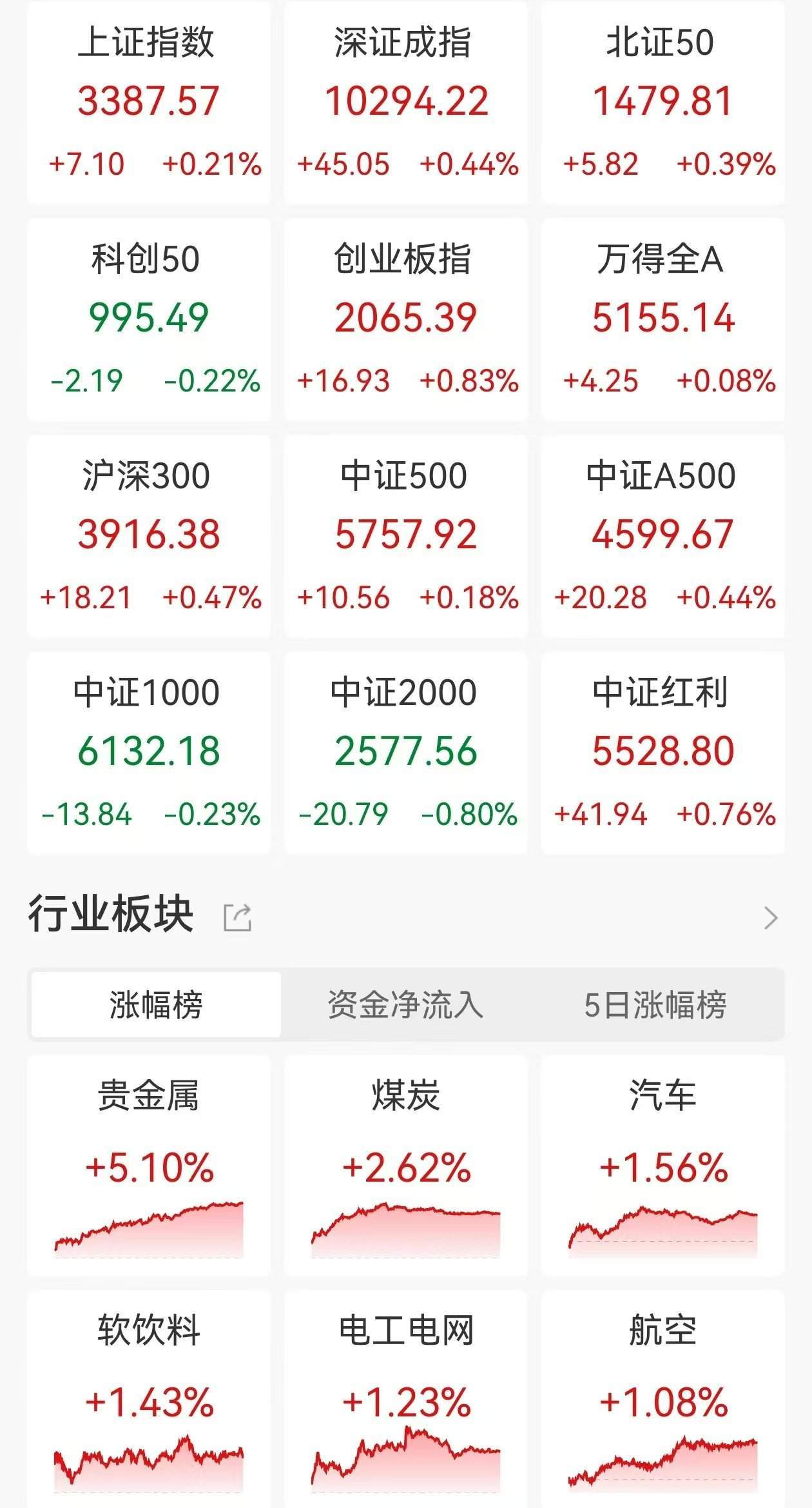 格隆汇5月21日|A股三大指数今日集体上涨,大小盘个股分化,截至收盘,沪指涨0.21%,深成指涨0.44%,创业板指涨0.83%,北证50指数涨0.39%。全市场成交额12143亿元,较上日放量31亿元。全市场3500只个股飘绿。板块题材上,贵金属、固态电池、煤炭、电力、创新药板块领涨;工业母机、PEEK材料板块领跌。