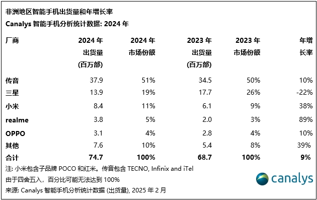 由于较早进入非洲市场的先行优势,传音控股在非洲拥有较高的市占率。根据Canalys的数据显示,2024年非洲智能手机出货量同比增长9%,达到7470万部。2024全年,传音控股在非洲的市场份额依然超过一半,为51%,年增长率10%,与市场基本持平。但其他品牌竞争对手的攻势却不容小觑,2024年小米、realme、OPPO品牌的年增长率分别为38%、89%、10%,非洲市场这块蛋糕,已经被众多后来者盯上,传音控股在这一市场的绝对地位,或也面临危机,需要随时警惕其市场份额被蚕食。